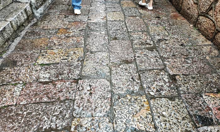 古城地面的石头颜色是天然形成的,为红色角砾岩。当地被称为“五花石”,雨季不泥泞,旱季不飞灰。