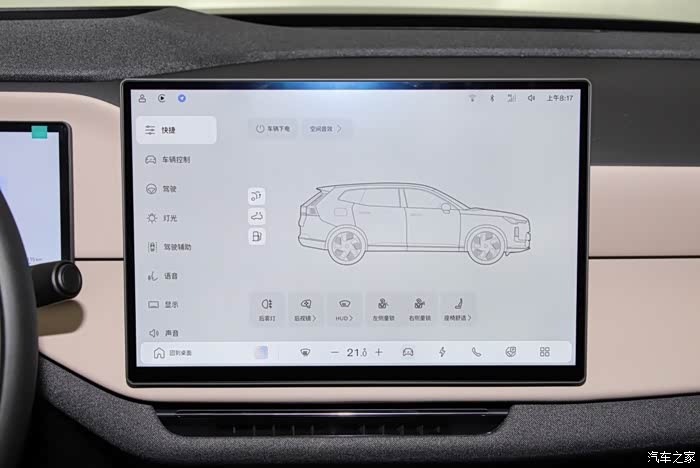 中控部分配备了大尺寸触控屏,操作流畅且功能丰富,集成了车辆设置、喜马拉雅、酷狗音乐、爱奇艺和高德导航等常用应用,科技感不错。方向盘握感舒适,左右按键分区明确,质感也到位。