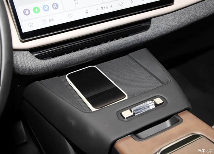 车内储物空间设计得很用心:前排配备带防滑颗粒的手机无线充电区,扶手箱下方做了大容量镂空储物格,后排空调出风口下方也设置了储物空间和电源接口,日常使用非常方便。