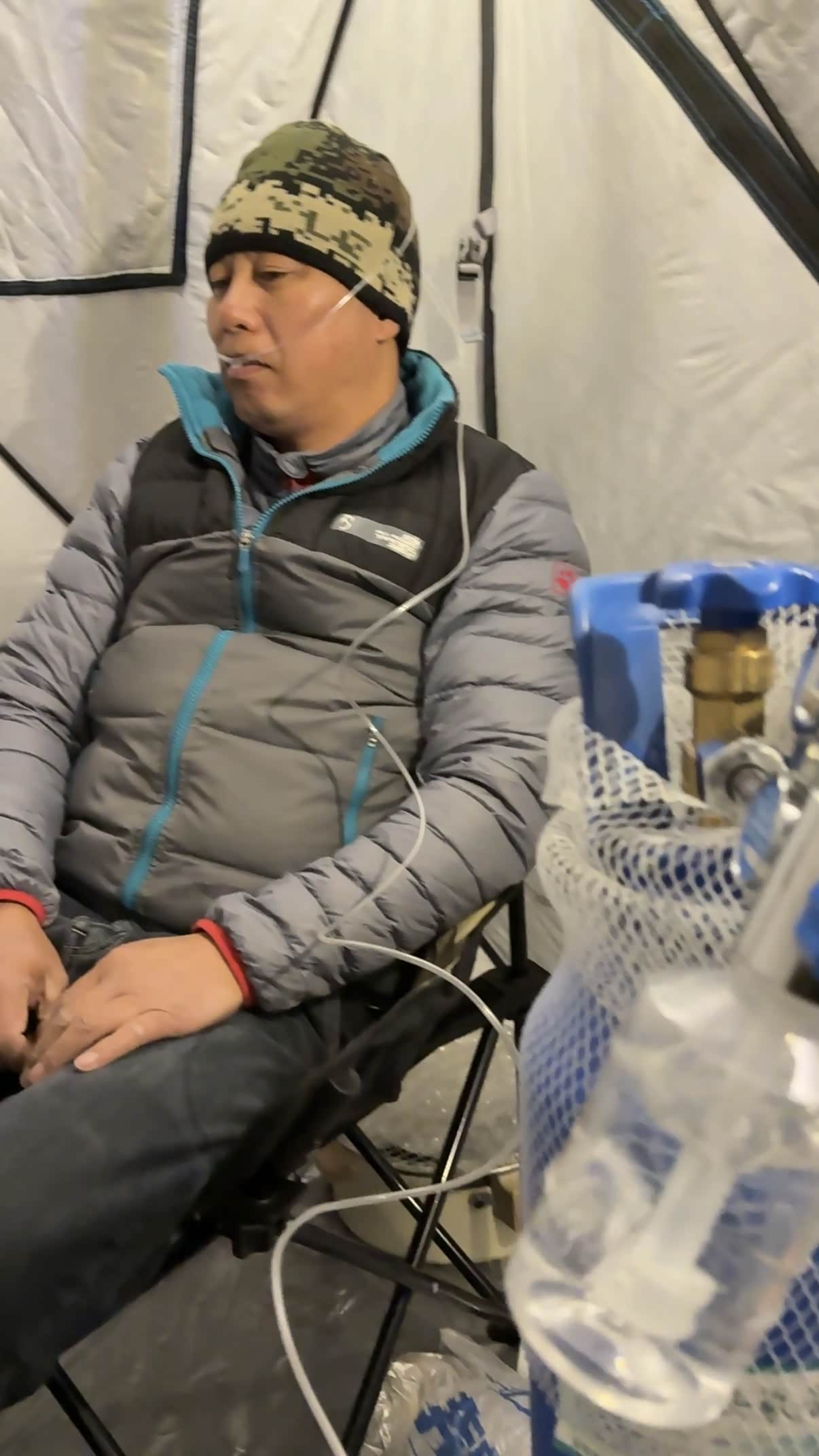 从下午的5:00,一直到晚上9:00多,天色已经完全的漆黑一片,此时我们准备在海拔4800米的位置安营扎寨,美美地吃上一顿大餐,但是让我们没想到的是这体力消耗实在是太大了当我们把帐篷搭好以后,此时此刻已经完全没有心情,也没有体力来做大餐了,只想抱着氧气筒。