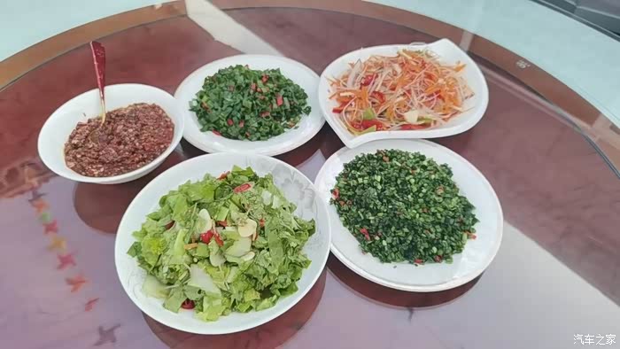 这是第二天的早餐,这些小菜都生的,左边是大葱,右边是韭菜,基本没动。