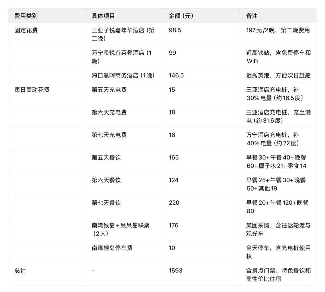 东线新增猴岛与呆呆岛门票支出,但联票性价比高,充电成本依然低廉,3天两人总花费1593元,性价比远超预期,明细如下: