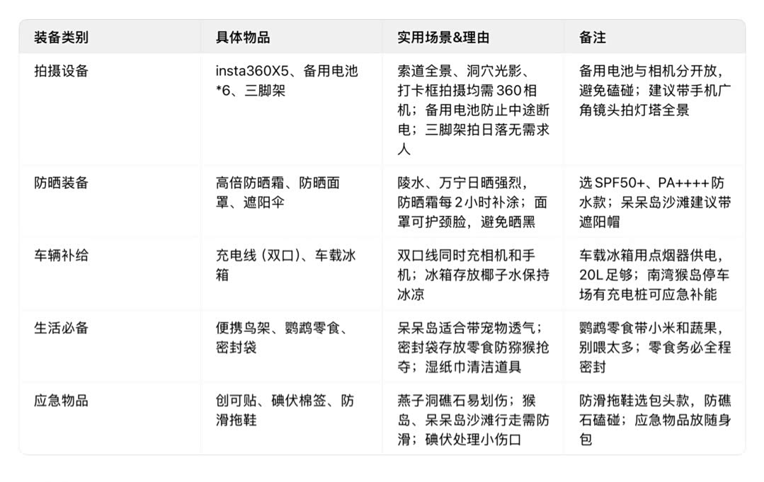 表2:东线自驾核心装备清单(拍照&续航重点)