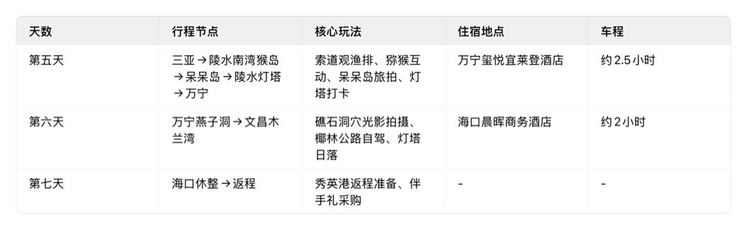 从西线的松弛、中线的野趣,到东线的惊艳,7天环岛之旅在海口的夜色里落下帷幕。收拾行李时,看着insta360X5里的素材——咖啡在呆呆岛打卡框前的歪头杀、猴岛上猕猴的机灵瞬间、红峡谷漂流的尖叫、木兰湾的日落,每一段都鲜活又温暖。