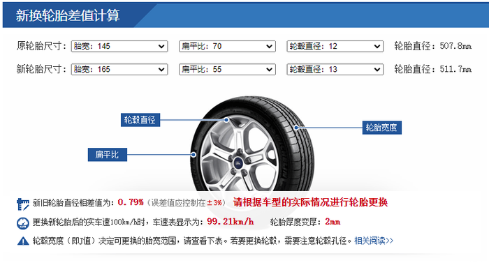 这两位博主直接采用宝骏旗下的E300铝合金轮毂(除12寸升级到13寸外)其余的轮毂尺寸都和我们原车完全匹配,然后搭配的轮胎是165 55R13,我通过轮胎换算统计了下,换号后的尺寸和我们原车的尺寸几乎差不多