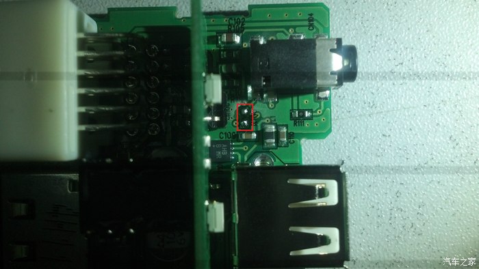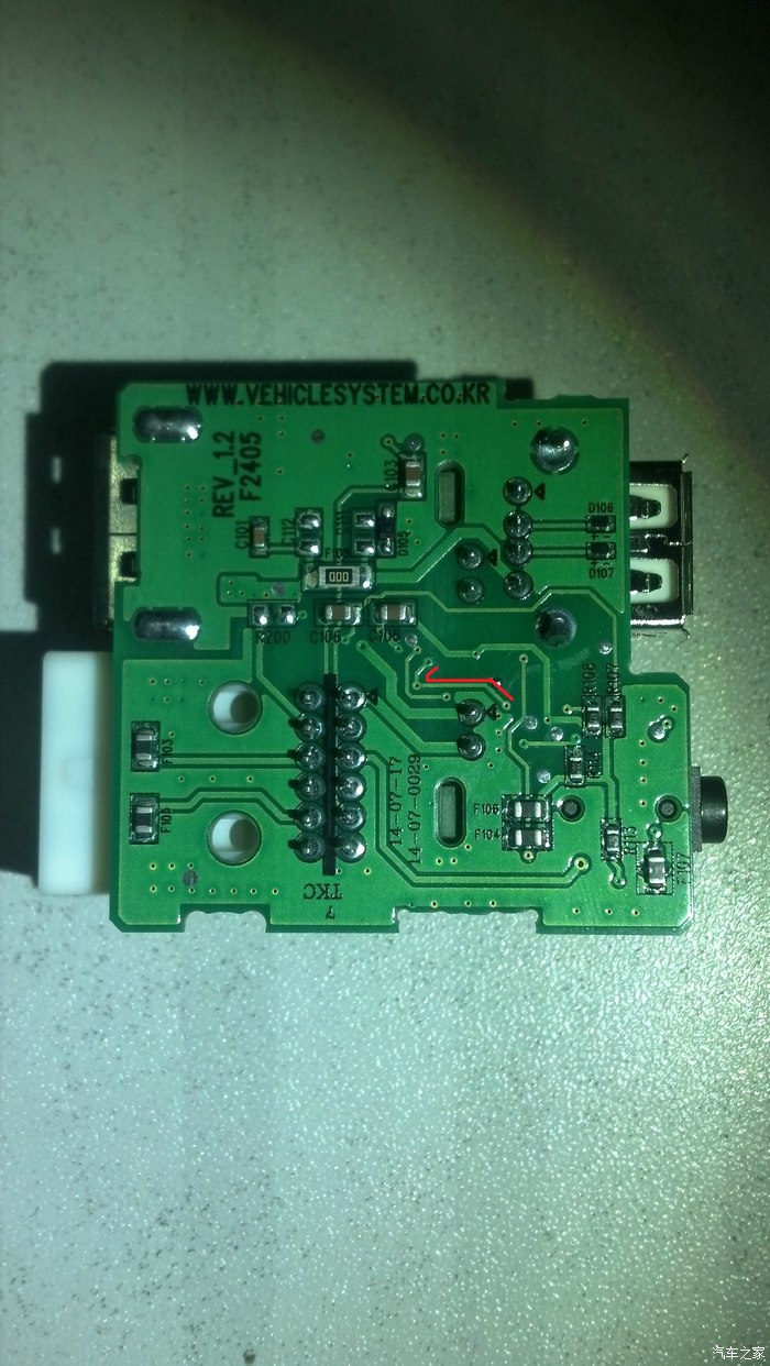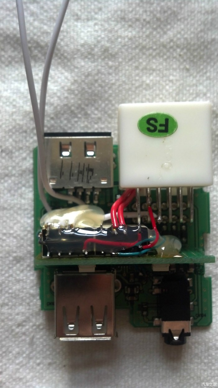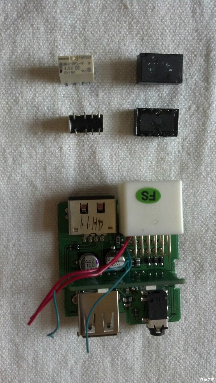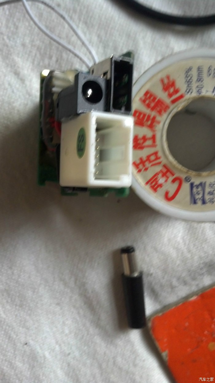 看到插座上面从上往下数第二个插针上的红色线吗,也不用去管它,它也是空脚,原车不使用的,本想利用它来输入倒车灯的信号来激活倒车影像,后来发现不太方便,直接安装了一个通用性比较好的5.5MM电源插座上去了,这个线没拆。从上往下数第三个插针后面焊着白线,这个是向中控输出的视频信号,接在控制视频选择的继电器的动触头上了,倒车时切到倒车摄像头,平时行车就切在行车记录仪的视频上。