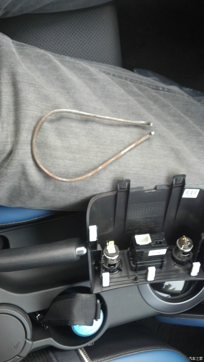 下面来说一下改装过程吧,首先要拆掉点烟器和USB模块那块板,自己做了一个工具,好容易才拿下来,太紧了,一共7个卡扣,5个活的2个死的,有必要那么变态吗。。。。。又不会掉。。。。。顺带说一句,青岛地区的你不想自己再弄这个小工具了,可以来借用一下,呵呵!