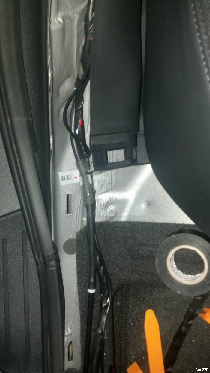 剩下的就是放线了,我从中控经过副驾驶手套箱到副驾侧迎宾踏板地下,沿着原车线束一直走到后门后侧中间,然后一路接去倒车灯,一路继续往上走到顶棚,穿到车顶上后尾门的胶皮软连接,最后到达摄像头。