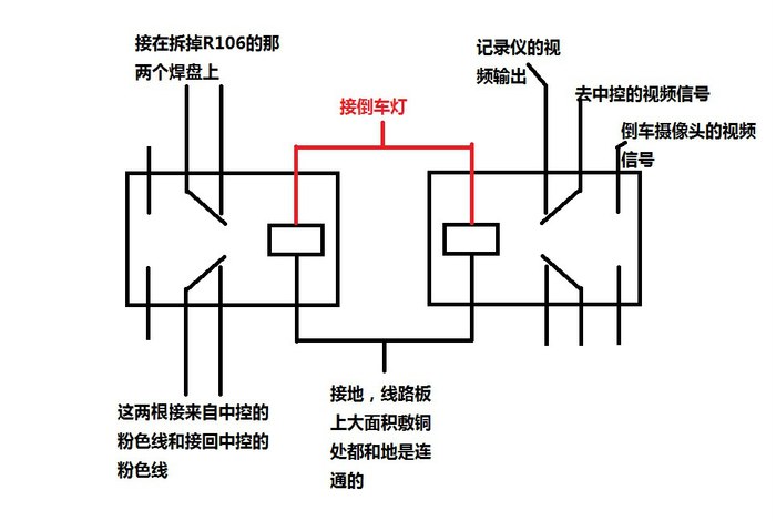 下面说明一下这两组线分别控制什么,红线直接接去插座上那个是用来控制原车中控行车切断视频的那组信号的,不然你投上去的倒车影像,车一动行车电脑就会切断视频,显示为了行车安全,请不要观看视频!我们在倒车时需要切断这个信号,防止视频被关掉。这根线在中控的后面是粉色的!后面还会提到这根线。 绿线就是接到R106焊盘上的那组是用来告诉原车中控,我插了一个音视频输入设备进来,要求显示图像。就好像一倒车你就把摄像头插到USB旁边的那个外接口上让车中控显示这个摄像头的图像一样,只不过这个过程被我们外加的两个继电器自动来完成了。电脑上没有画线路图的软件,我用画图画了一个,挺恶心的,将就着看吧!
