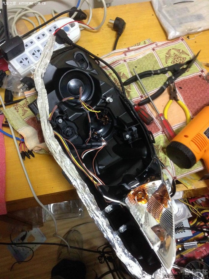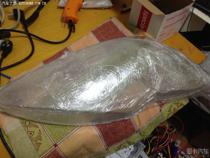 第一次改灯没有经验,首先就是灯开的不满意,自己弄一把热风枪,一个自制烤箱(相信很多人都是这么搞的),灯被撬的像狗咬的,惨不忍睹,也稍微有点小变形。透镜采用的是国产的垃圾透镜+雪莱特灯泡,远光才有的Z9碗,整体效果当时还是很满意的,不过国产透镜老化快,国产灯泡亮度也不行,半年多使用下来,明显感觉不如当时亮,所以才萌发了再改一次,一部到位的念头。