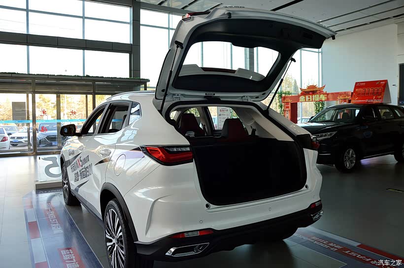 后风挡面积减小,另外搭配上窄下宽的整体造型,让这台欧尚X5的尾部看上去非常饱满耐看。不足之处是,两边的排气口是装饰件,并非真的双边双出排气。