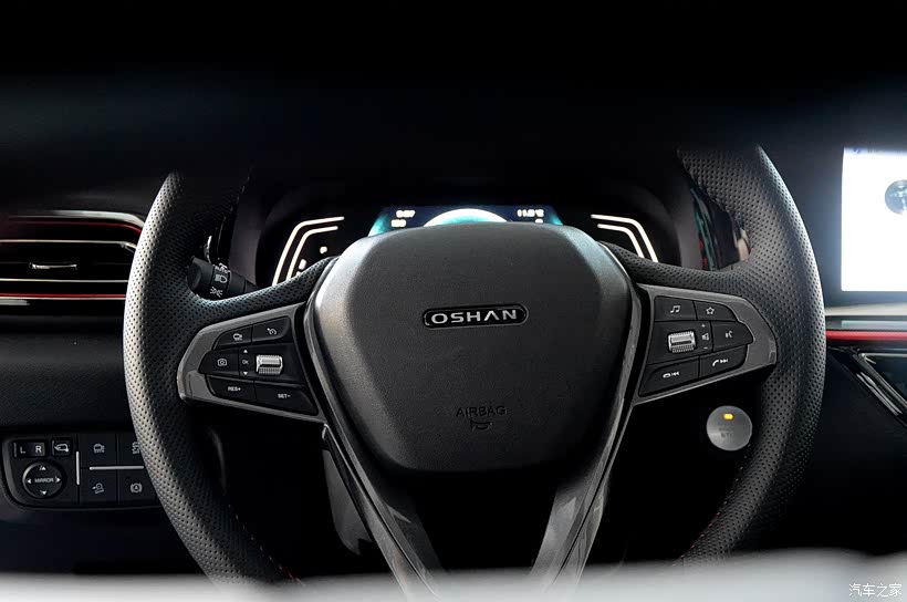 三幅式真皮多功能方向盘带打孔处理工艺,握上去的手感很不错,样式和欧尚X7的基本一样。这台顶配车型配备的是定速巡航功能,能够选装ACC自适应巡航+人脸识别选装包,不过需要另外加6千元,值不值得还得看自己。