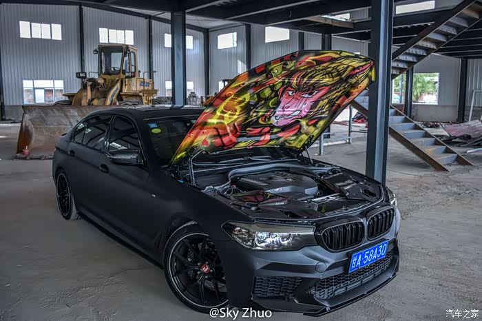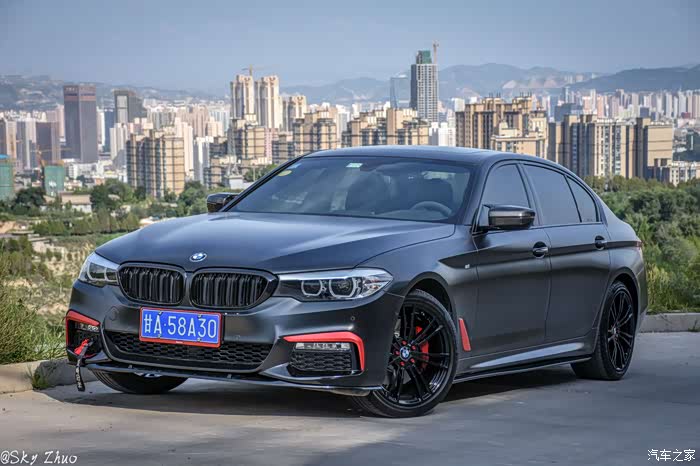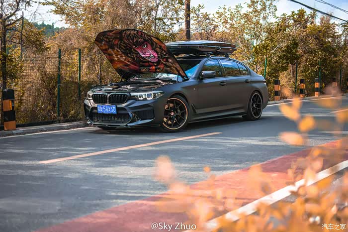 第一次见到这台530时内心还是有些失望的,虽然这是一个改装轮毂,但是我当时真的觉得这就是一个原厂轮毂喷了黑色,我看到的更多就是扎眼的红色装饰条,红色牌照框,喷红的刹车卡钳,还有写着及时行乐四个大字的拖车带,这感觉真的真的很不符合我的审美,但是这么一台原厂就比较高颜值的新款5系上,其实还是能把它改的很好看的。