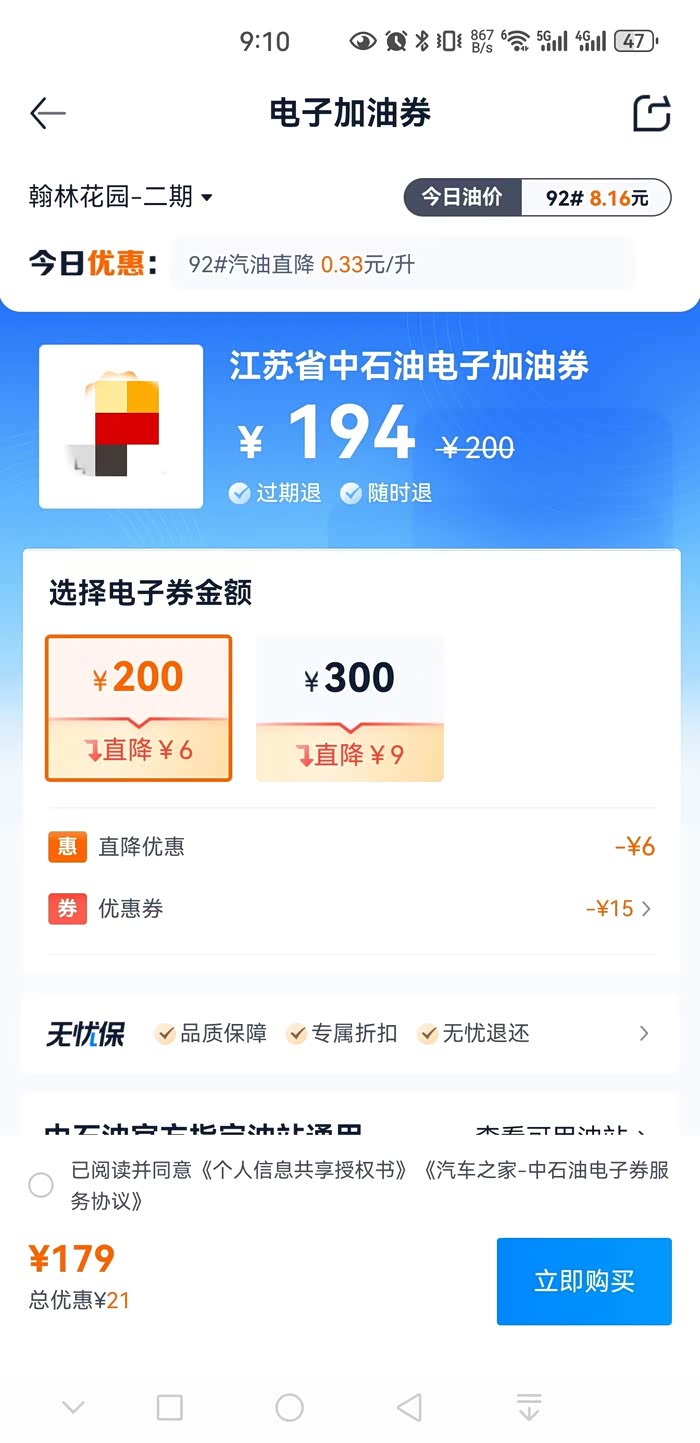 加油选择95号即可,这里要说下,在油价高居不下的情况下,参加好的加油活动很重要,比如汽车之家里的中石油加油,有活动必参加,还是很划算的,另外很多信用卡还会定期发放中石油中石化的加油券,大家都可以选择使用。像我以中石化加油为主,根据活动要求,会在周五一次性充值4000元,会赠送加油券和抽奖机会,抽奖又可以获得几十元不等的加油券,一般加油也会尽量安排的周五加油,因为双倍积分,积分又可以免费洗车(主要给我的老车机洗