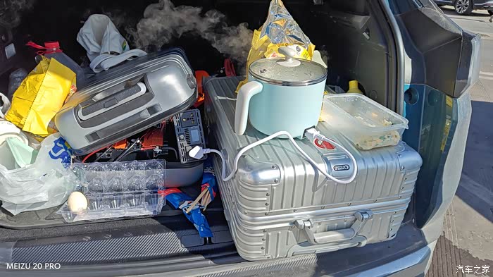 逆变器是1500W纯正弦波的(其实只带电锅一类的设备,方波的就行,还便宜),电源和逆变器可以全部收进行李箱。图中电锅是600W,1.2L的,烧开满锅水用时10分钟左右。
