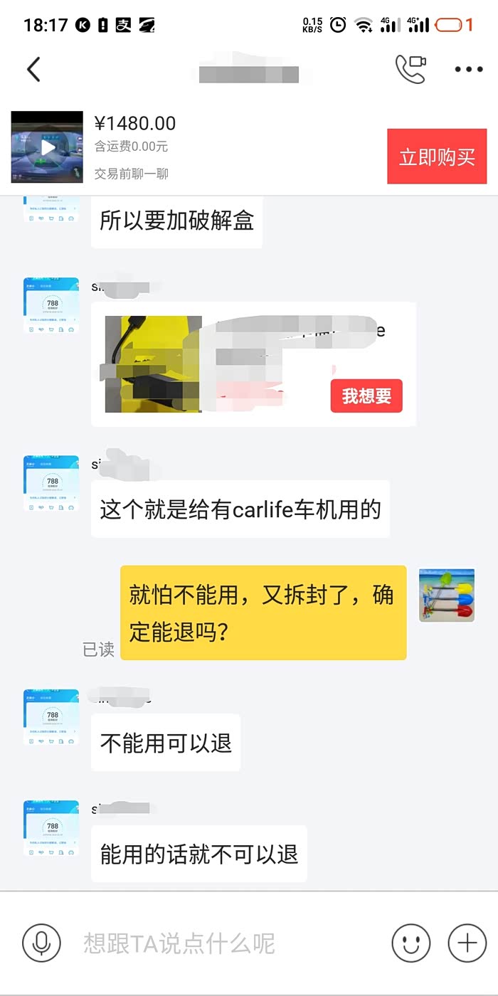 在某鱼黄了许久,终于找到了亚洲龙carlife专用版的,跟卖家小谈以后,还是担心万一买来不能用怎么办,所以就跟卖家协议要是不能用就可以退货,卖家同意后,抱着尝试的心态就下单了。
