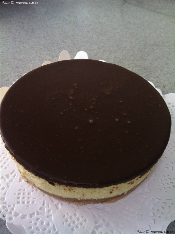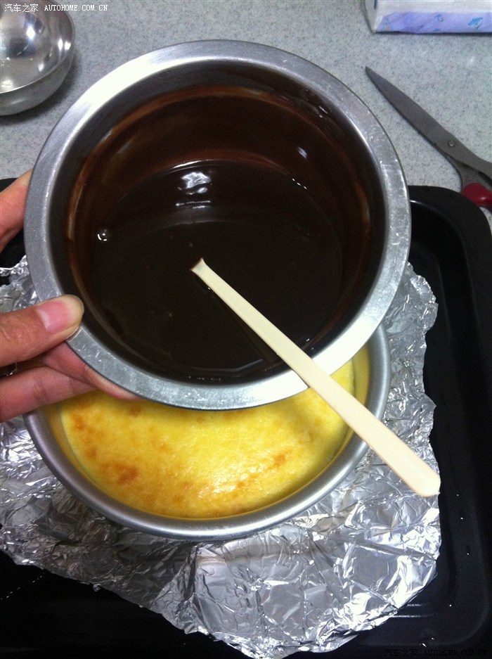 取出烤好的奶酪,冷却到室温,然后倒入已经融化好的巧克力,放入冰箱冷藏