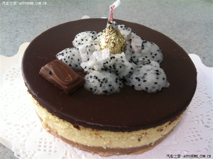 这是我烘焙生涯中的第一个蛋糕,装饰略显粗糙,各位将就看看!