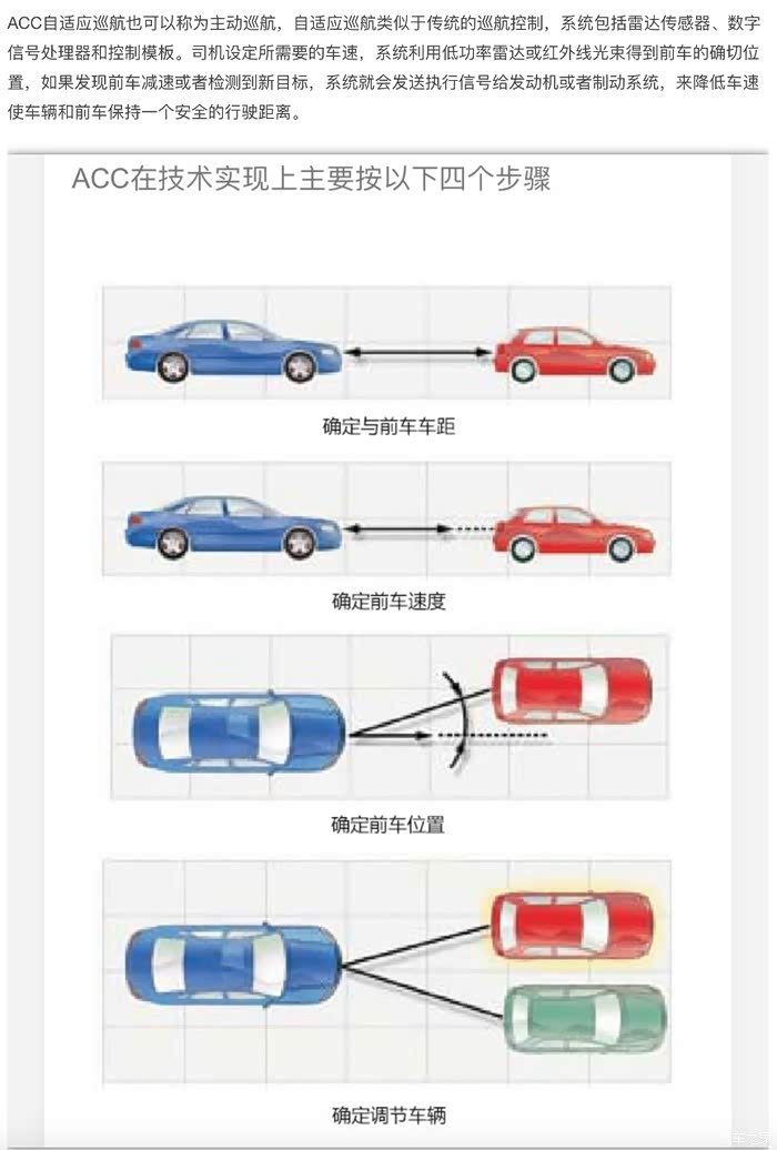 自适应巡航控制(ACC)是一个允许车辆巡航控制系统通过调整速度以适应交通状况的汽车功能。安装在车辆前方的雷达用于检测在本车前进道路上是否存在速度更慢的车辆。若存在速度更慢的车辆,ACC系统会降低车速并控制与前方车辆的间隙或时间间隙。若系统检测到前方车辆并不在本车行驶道路上时将加快本车速度使之回到之前所设定的速度。此操作实现了在无司机干预下的自主减速或加速。ACC控制车速的主要方式是通过发动机油门控制和适当的制动。