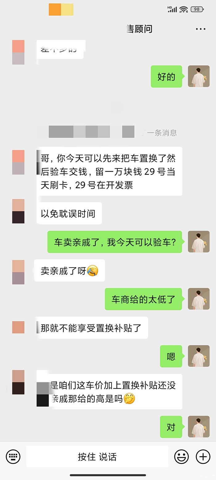7月19日在一个车友口中得知他也是二手车置换,车自己卖的领了厂家3000元置换补贴,我找到销售说了这个事销售说不可能,必须在店里卖车才有置换补贴,于是我打了厂家400电话反馈,后来销售联系我告诉现在提交二手车买卖的资料能给申请到1900,我不同意。