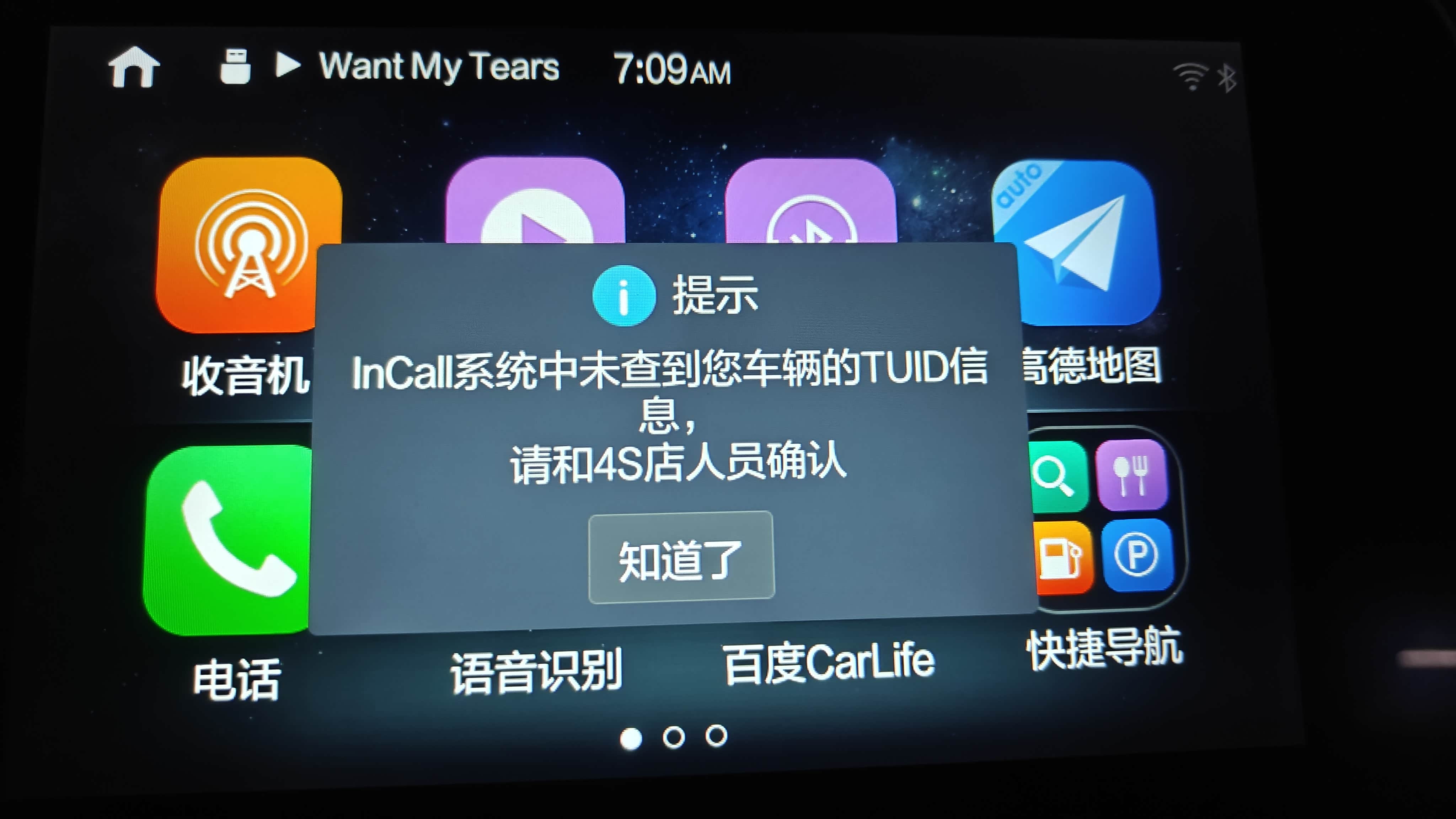 这是车机和InCall系统的绑定信息丢了,不影响用车但得去4S店让他们重新绑定车辆的TUID信息,连电脑刷新下系统就能解决,很快的。
