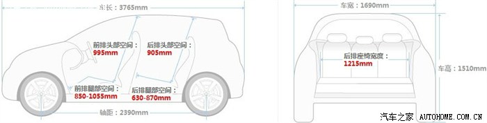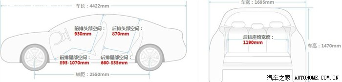 (2)车内空间:前排头部空间930(局促,小于赛欧995少65),后排头部空间870(局促,小于赛欧900少30),前排腿部空间895-1070(赛欧865-1065)、后排腿部空间660-855(赛欧695-920)、前后排腿部空间总和1750(适中,小于赛欧1785少35),后排座椅宽度1190(局促,小于赛欧1230少40,3人乘坐比较拥挤)。