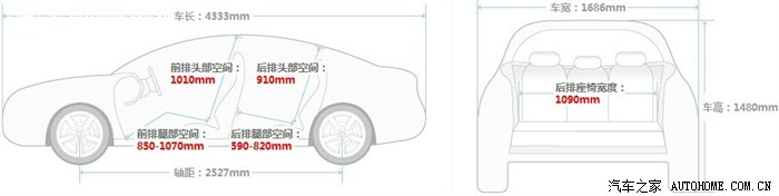 (2)车内空间:前排头部空间1010(宽裕,大于赛欧995多15),后排头部空间910(适中,大于赛欧900多10),前排腿部空间850-1070(赛欧865-1065)、后排腿部空间590-820(赛欧695-920)、前后排腿部空间总和1670(局促,小于赛欧1785少115,前后排同时乘坐两位身高180成年人腿部不挤,总长起码要在1700以上),后排座椅宽度1090(局促,小于赛欧1230少140,3人乘坐比较拥挤)。