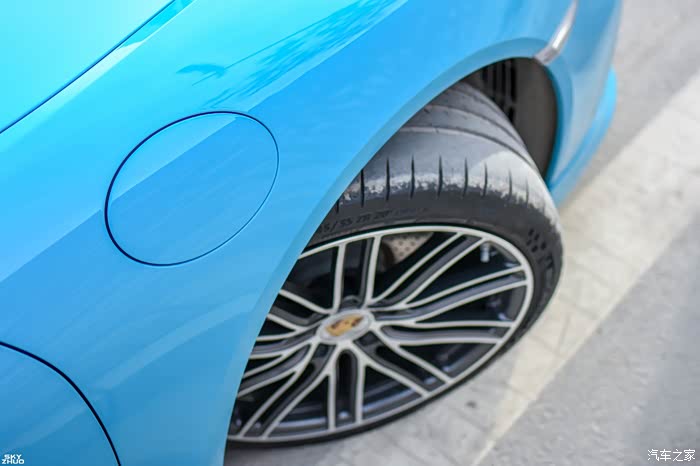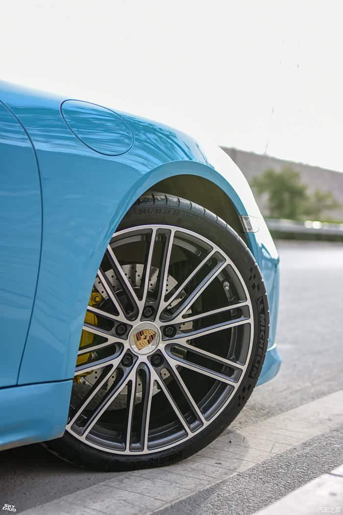选装的20寸多幅轮毂,清楚的看到大尺寸打孔通风刹车盘和黄色卡钳,前235 后265 30 R20米其林轮胎,很薄,视觉效果比原车的18寸好了太多。