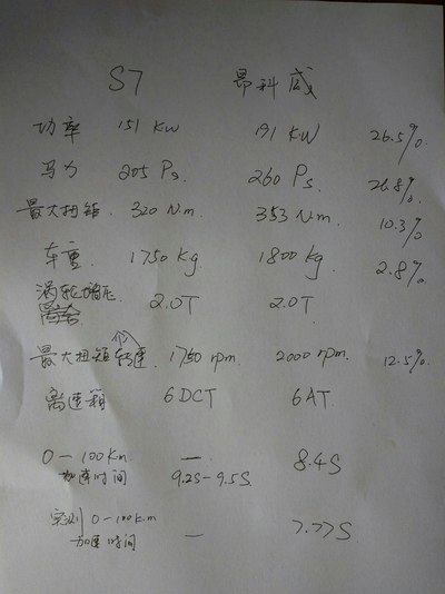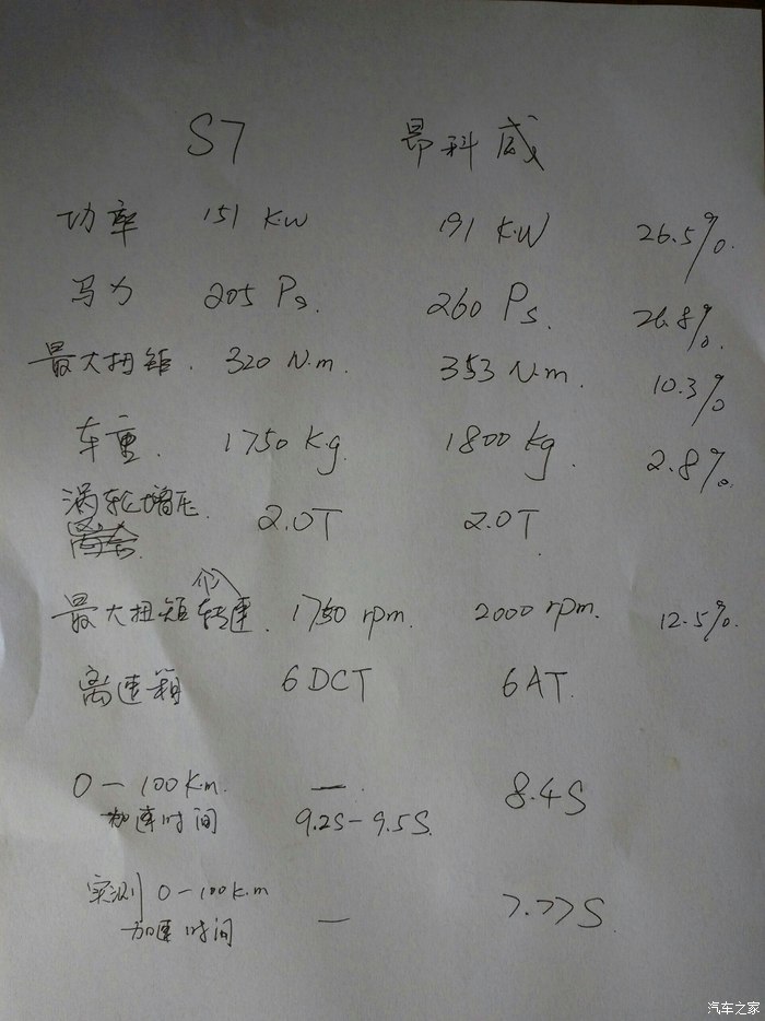 S7 Vs 昂科威发动机数据由于比亚迪官方没有给出 0 - 100km 加速时间数据,对于S7 0 1 时间众说纷纭。 为了得到一个可靠的估计 , 我对比了一下同为 2.0T 的昂科威。 从数据上看昂科威数据漂亮,功率和马力都比S7 高约 26。 但最大扭矩只高出 10 。 S7 达到峰值扭矩转速比 昂 低,也就是更早一点进入最传传动效率。加上S7 采用双离合变速箱 ,换档效率有优势。 毕竟昂功率要高 ,单位时间产生功率要比S7大,加上四驱驱动平衡,抓地好 ,起步少打滑。 综合下来 , 大胆假设两者同时到达最大扭矩且速度相等。 这时两者在各自最大扭矩驱动下运动, 昂 的牵引大比S7 大 1...
