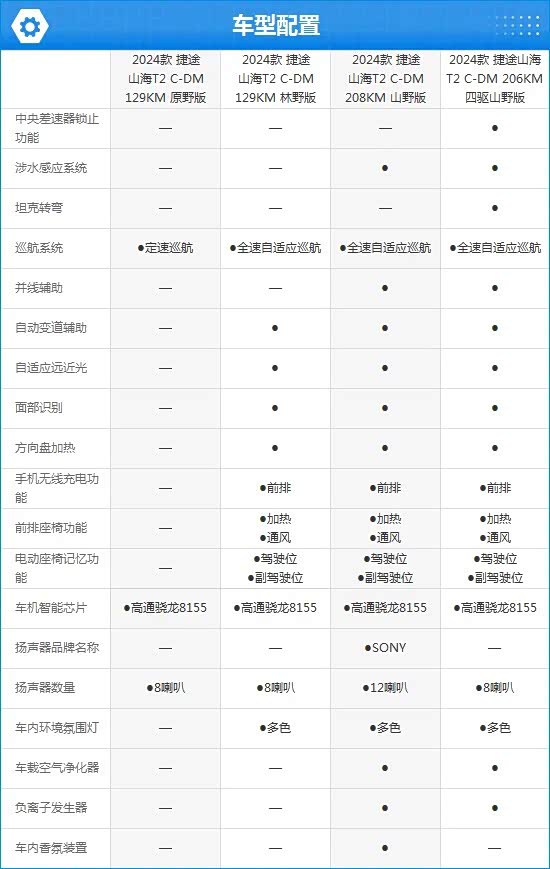 通过配置对比发现,2024款捷途山海T2提供两驱和四驱两种驱动形式以及多种续航版本,能够满足不同消费者所需。同时,入门版车型的功能缺失明显,而从次低配开始,配置表现开始符合主流水平。反观顶配版本,其更注重动力表现和四驱系统,配置方面反而不如次顶配丰富。