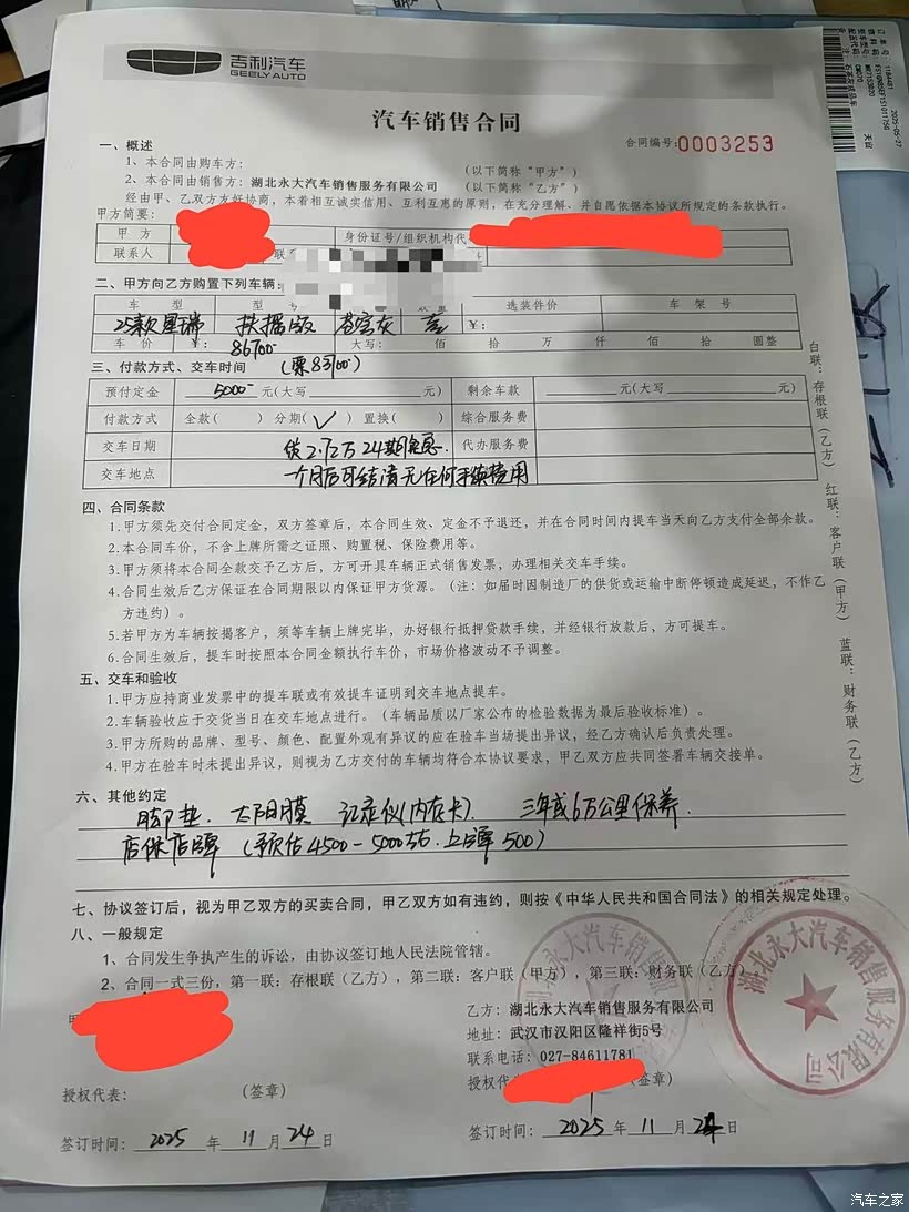 于是我一直等到11月底,想着抄底2025款。联系销售后,选了个优惠力度大的周末,特意去了武汉——毕竟湖北的车价优惠向来更给力。最终谈下来的优惠还不错:现金优惠1.9万,分期再减1000,加上大客户优惠2000。不过保险有点超预算,被算到了5200多,虽然不满意,但为了分期优惠也只能接受。
