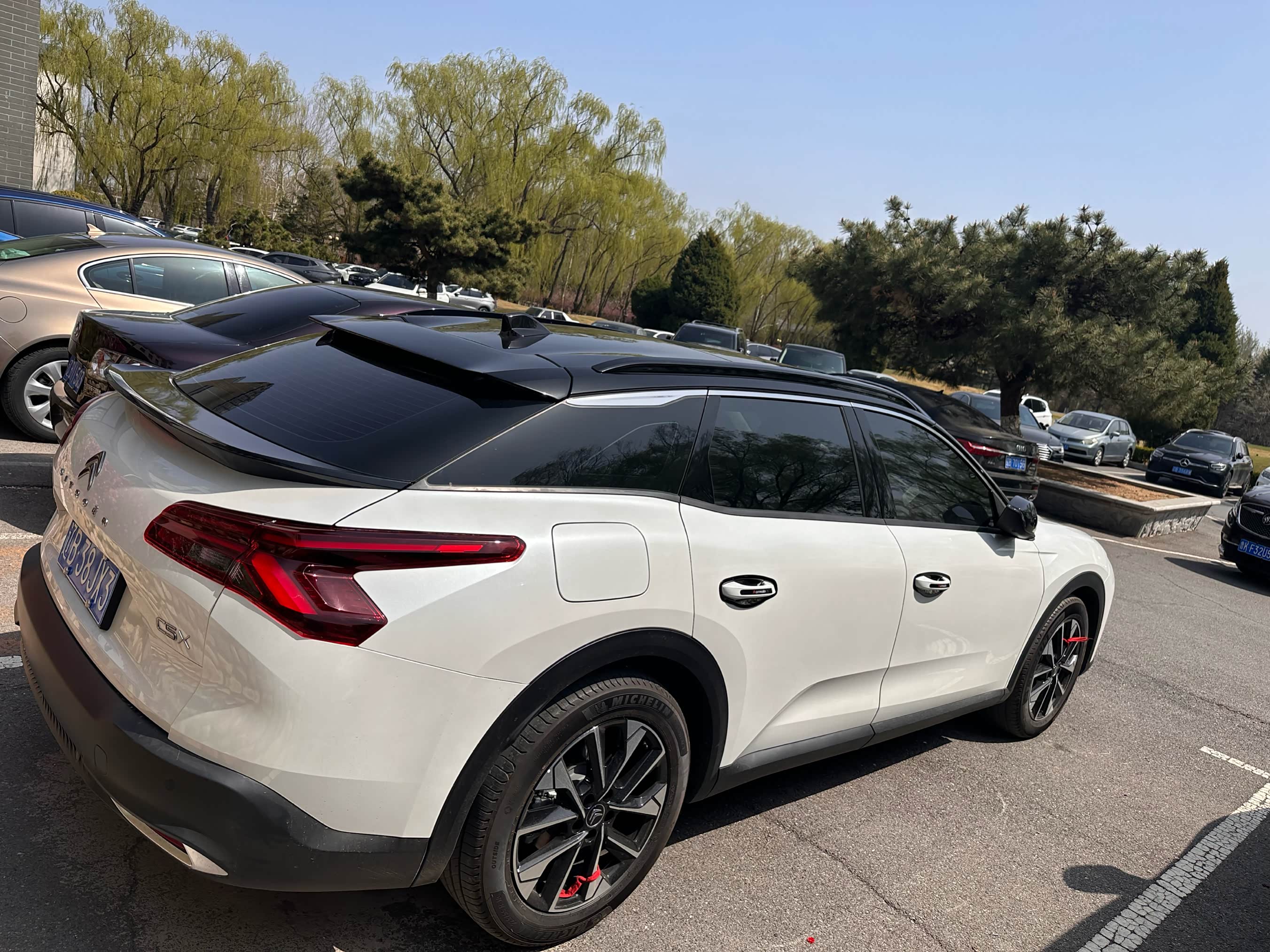 1.这台车的外观很漂亮,我选的是珠光白加黑顶的颜色,两个黑耳朵,黑白配视觉冲击感很强烈。4.8米的大车身,从侧面看显得很修长。X型日行灯的设计也很有个性,我感觉这台车的颜值更适合年轻人开。全铝合金的引擎盖设计走的是简约路线,从正面开大气又不失优雅。车身腰线硬朗,4个车门下面均设计有挡泥板,雨天可防止泥水进入车子下裙,上下车不用担心弄脏裤腿。车尾造型饱满,双尾翼设计,并且上尾翼中间是空的,跑高速时气流可以吹干净后风挡玻璃。下尾翼压风,可以增强车辆高速行驶的稳定性,做到高速不飘。