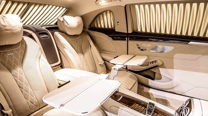 6.5米的车身被分为两个区域,通过电动控制的隔断,完美的区分开前排驾驶舱和后排乘客舱两个独立空间。不过,乘坐者也随时可以通过车载对讲机,与司机进行沟通。这个宽敞的、奢华的后排休息室具有绝对的私密性,而且“总统级”座椅还可以让两名VIP乘坐者45度平躺休息。