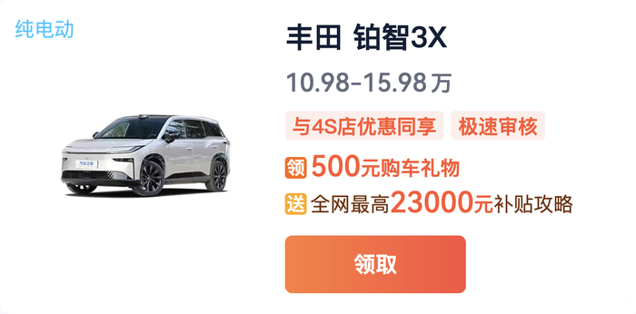 最近广汽丰田推出铂智3X,共推出7款车型(含两款高阶智驾版),售价10.98万-15.98万元(高阶智驾版14.98万和15.98万)。