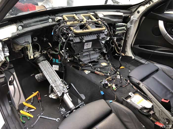 我的宝马328im购于2013年,提车时车内只有新车的异味。行驶几个月后新车内饰异味慢慢消除,行驶到第三年夏天车内气味开始慢慢变浓,有一股刺鼻的味道,头晕,鼻子很难受,行驶中开窗或开空调才能缓解异味出现,坚持到今年第6年,异味问题已经很严重,春季气温回暖,根本无法在车内乘坐行驶。为了解决异味问题,先后更换过地垫、后备箱垫、空调清洗、蒸发器清洗、臭氧消毒…折腾过无数次,花费几千,问题始终未能解决。最近的内饰异味污染物闹得火热,论坛搜索看完才知道异味问题在多款车型都存在过,污染源主要有用做隔音减震材料的沥青、隔音棉等材料。官方也没通知召回 考虑到家里有小孩,对异味非常排斥,车已行驶14万公里,各性能部件都还很不错,为这个异味换车也不太现实,但这个问题也不想再忍,于是将车开到朋友店进行内饰全拆。找出异味根源. 望版主申精 感谢