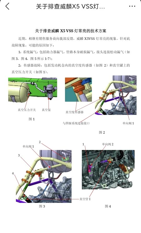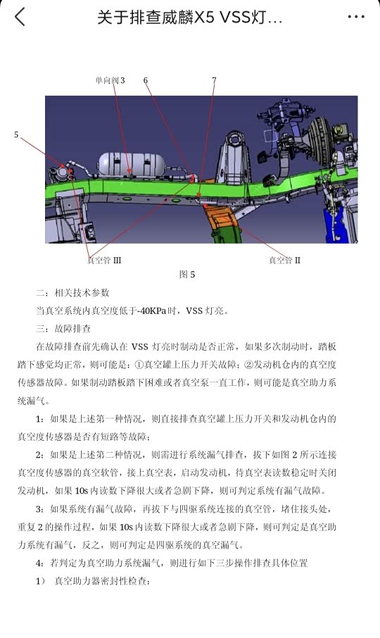 4、真空漏气的原因:真空电子阀(4驱、涡轮)、刹车助力泵、真空管线(共6套)从防冻液壶旁边电磁阀出来的管子通到底盘前桥真空气室执行器旁边的管子,摸一下有没有卡扣松动,有没有管子破裂的情况:↓