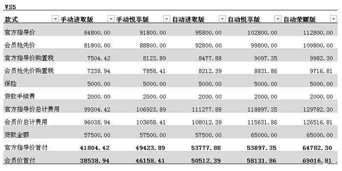 自己回家后做的捷达VS5各款车型的详细价格对照表!