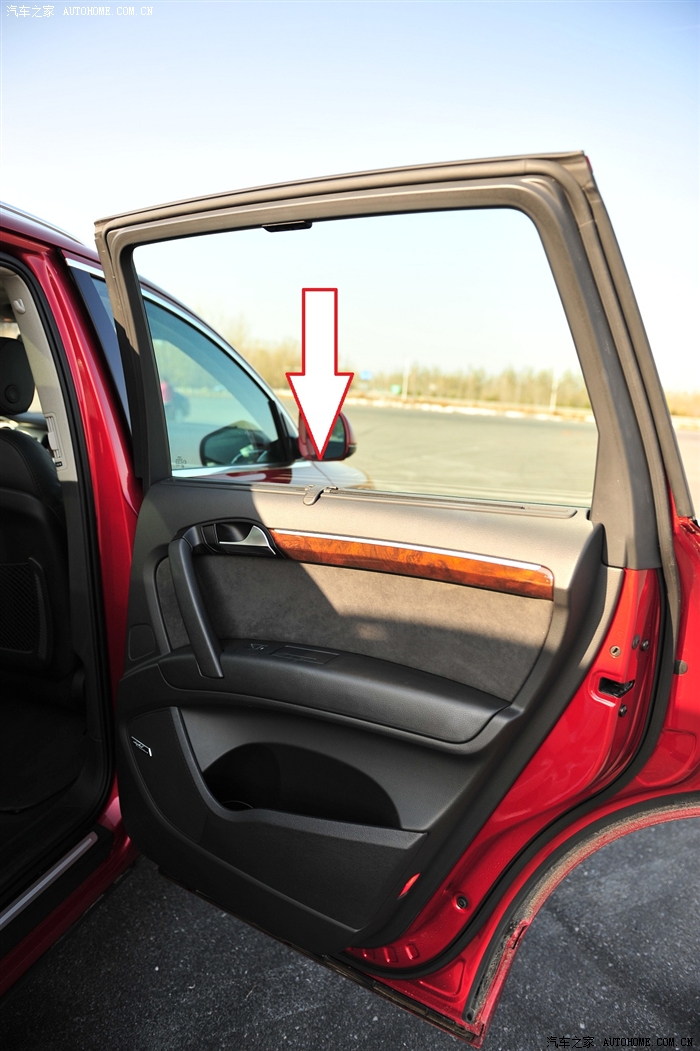 奥迪Q7后车门配备了手动遮阳帘,我全家都很喜欢这种设计,象家里的奔驰GL550 4matic直接给后车门配备的暗色隐私玻璃反倒不受我们欢迎,我们比较喜欢需要阳光与否由自己来做主,而宝马X5M干脆既没有隐私玻璃也没有遮阳帘,算是很大的配置败笔,比较令人惊喜的是Q7甚至给尾门也配备了手动遮阳帘.