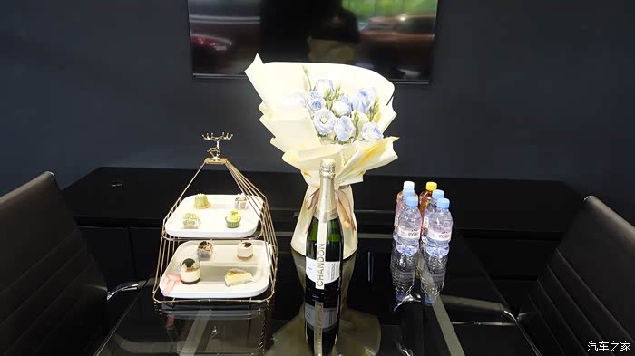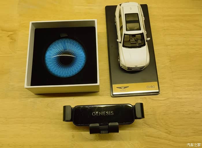 4S店用带有Genesis logo的饭盒装了午饭,还有附赠的香槟,点心和鲜花。提车礼送了我们一个手机支架,一个GV80的汽车模型,还有一个水晶球。