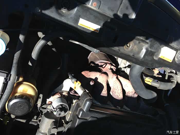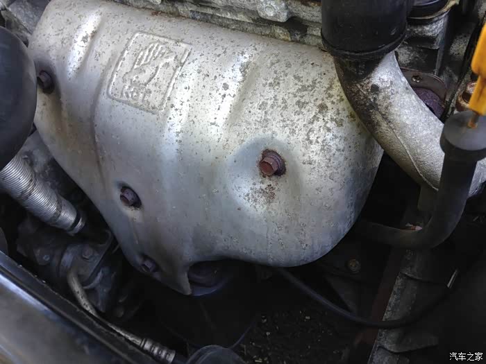 打开发动机舱,前置氧传感器就在防热罩下面。