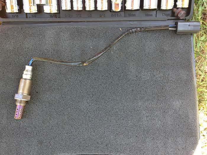 说回这次帖子内容。我朋友前一阵车子发动机故障灯亮了,我叫他去AutoZone免费读了个故障码,查出来是前置氧传感器坏了,那咱就首选自己搞咯,叫他从网上买来了规格适用的日本电装的氧传感器,和所用的开口套管,别的工具我都有。这更换这辆车的前置氧传感器,这应该是车上比较好换的的一样东西了。不过对于老车来说,换很多东西都会碰到锈住了,粘住了拧不动,或者容易滑丝,拧圆螺栓头,之类的问题。