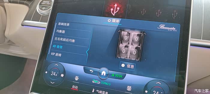 4D环绕立体声音响系统(俗称4D大柏林之声音响)构成,是由31个高级音响扬声器,座椅中的8个励磁器,1个带集成式放大器的重低音扬声器,1个总功率为1750W外置鼎级放大器组合而成