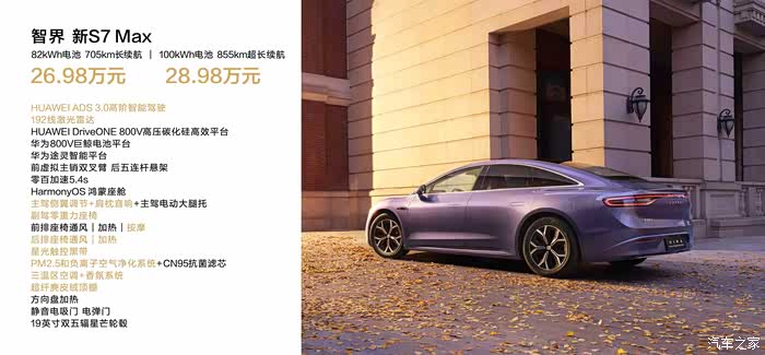 22.98万的Pro版,续航705km。26.98万的Max版有两个续航,一个也是705km,另一个加装一百度电池的就猛了,855km,比Model 3最高配多出了130km。这个电池原先是两万,现在送了选配金也就花八千,真香了好嘛。华为ADS 3.0也给了,就现在这颜值,这价格,还要啥自行车啊。