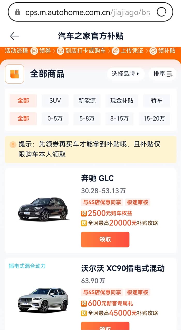 方法1:点击下方链接进入超级补贴活动输入想要购买的车型点击领取;https://cps.m.autohome.com.cn/jiajiago/brandlist?ext_bc_partner=1&ext_businessTags=13&pvareaid=6865492&eid=3|1411003|47|1344|212229|307198