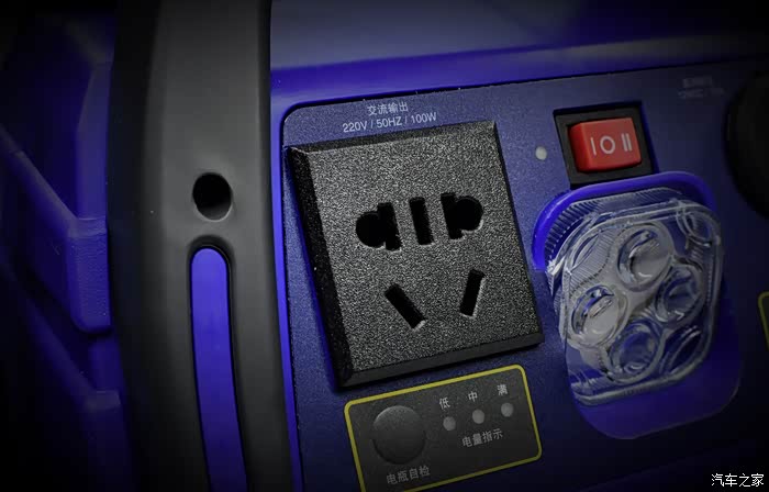 红色的是三档开关,I档为启动左侧的220V 100W交流输出,同时左侧LED灯点亮,O档为关闭100W交流输出,II档为下方的LED灯开启!