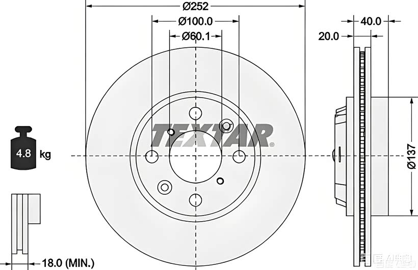 雨燕原厂刹车盘参数:外径252毫米,孔径100毫米,中心直径60.1毫米,新盘厚度20毫米,最小厚度18毫米,重量4.8公斤。