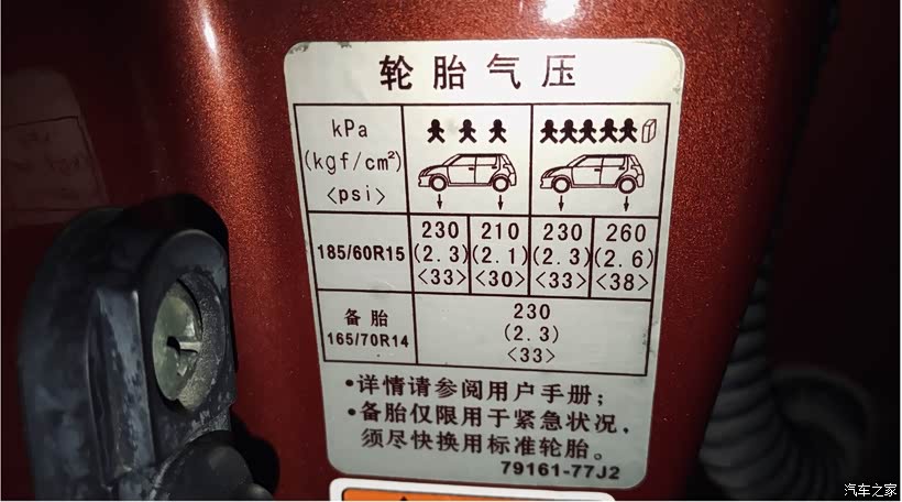 雨燕原厂标准胎压:3人以内前轮2.3 Bar,后轮2.1 Bar。(5人加重物前轮2.3 Bar,后轮2.6 Bar)