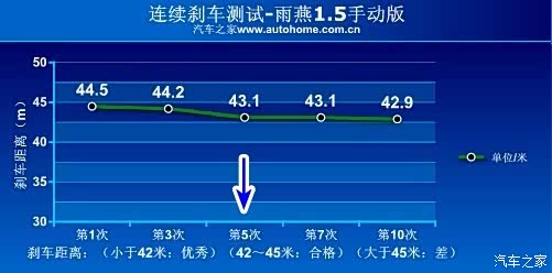 雨燕1.5手动版连续10次刹车测试成绩来看,原厂锦湖轮胎第一次制动成绩是比较差的44.5米,连续刹车4次以后,或许是轮胎温度起来了,最好的成绩也只能达到43米左右。