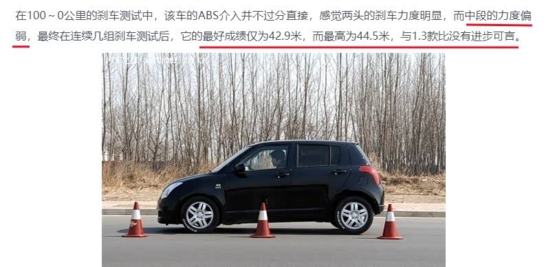 汽车之家测过雨燕1.5车型的刹车,头段和尾段的制动力明显,中段的制动力偏弱。在原厂轮胎的情况下,最好成绩42.9米,最差44.5米,与1.3车型的刹车性能相当,没有进步。