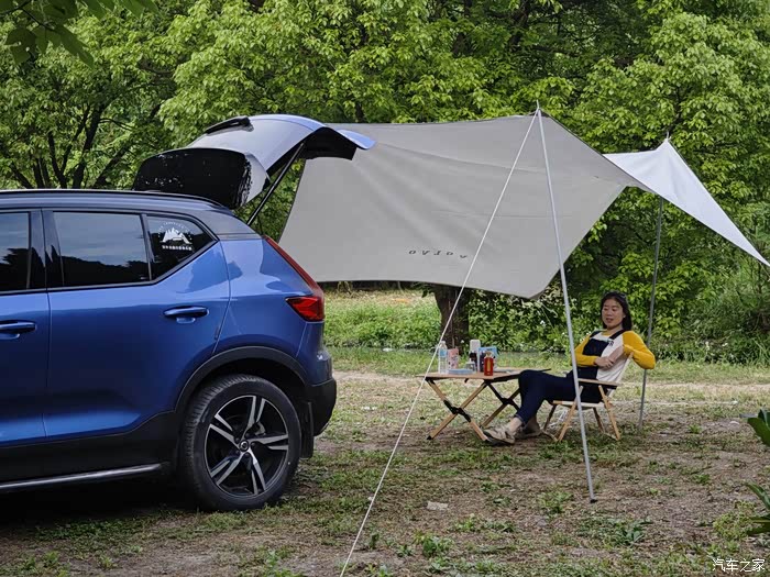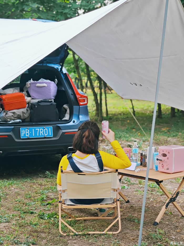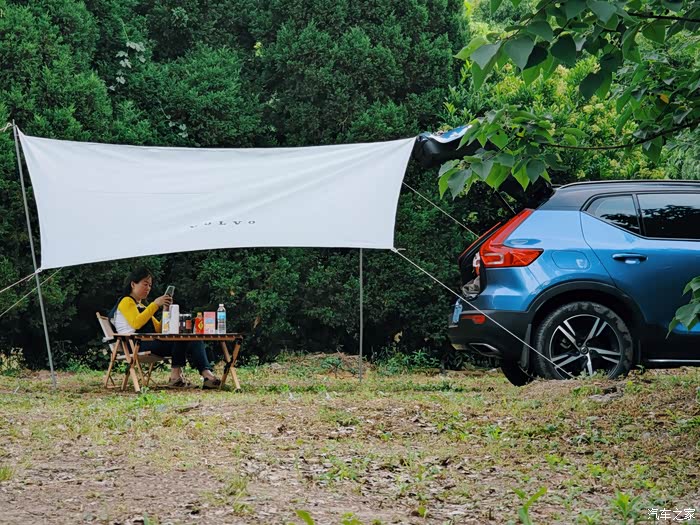 随着林志玲提示“目的地已到”,我们知道即将进入公园。这个郊野公园允许车辆直接驶入。我们找了一块空地停好车,不得不说,XC40的后备箱空间十分宽敞,折叠桌椅放进去只占了不到三分之二的空间,剩余的地方还能容纳我网购的露营箱、天幕等装备。当然,空间不能浪费,零食包等物品也尽可能地都放了进去。很快,我们便悠闲地搭好了天幕,开启了愉快的野餐模式。
